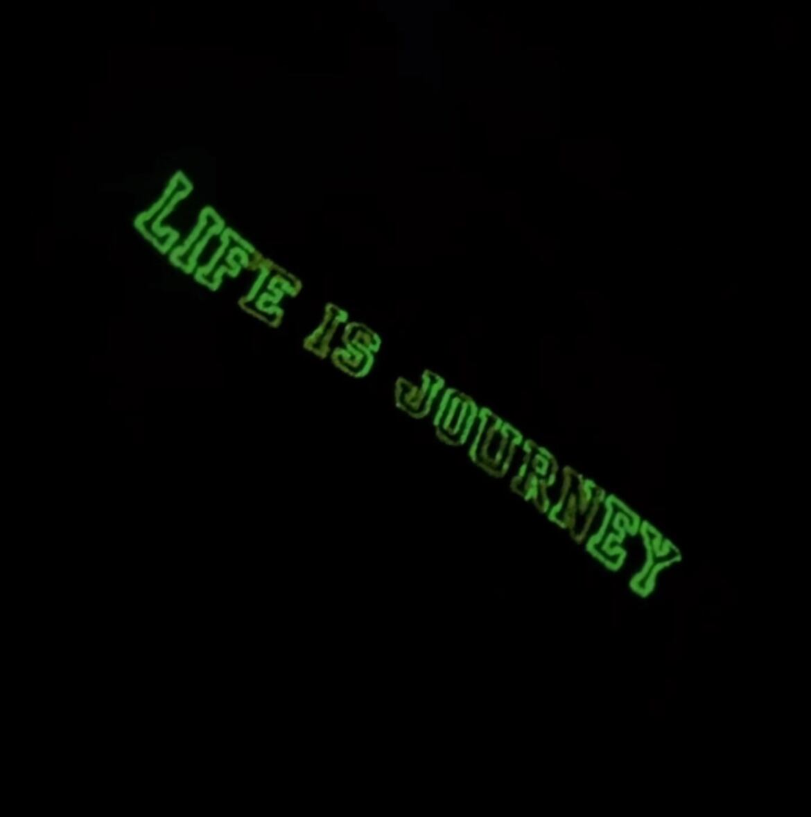 胸にOGロゴの上に蓄光塗料でLIFE IS JOURNEYをプリント。